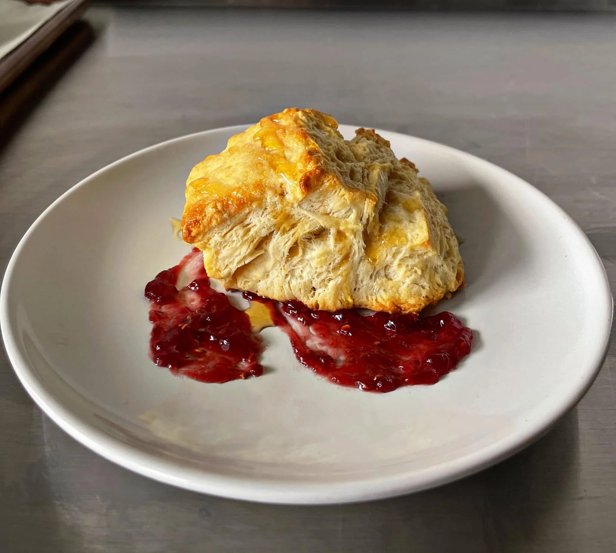 These biscuits came out tall and flaky with visible layers, but you’ll notice a bit of “lean” or unevenness in the shape. That happens when the stacking or final press isn’t perfectly squared off, or if there’s slight tilt during baking. It doesn’t affect flakiness or rise, but for ultra-straight sides, try trimming the edges of your final rectangle before cutting and make sure you press your final shape evenly. Keeping the dough cold and cutting straight down (no dragging or twisting) also helps the biscuits rise straight and stay tall.